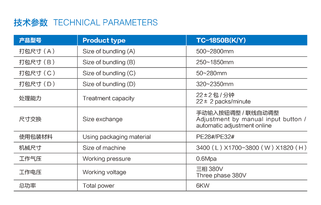 TC-1850B(K/Y)型瓦楞紙板捆綁機為推板推入送紙結構,結構承載力大,輸送定位精準、采用plc控制,人機界面調節參數配合十字開關調整和聯機自動換單調整兩種模式,多元化換單調整操作,可根據相關單元分享數據自動換單。打包相關動力采用伺服電機驅動、國際知名品牌氣動元件,動作流暢,性能穩定,節能。